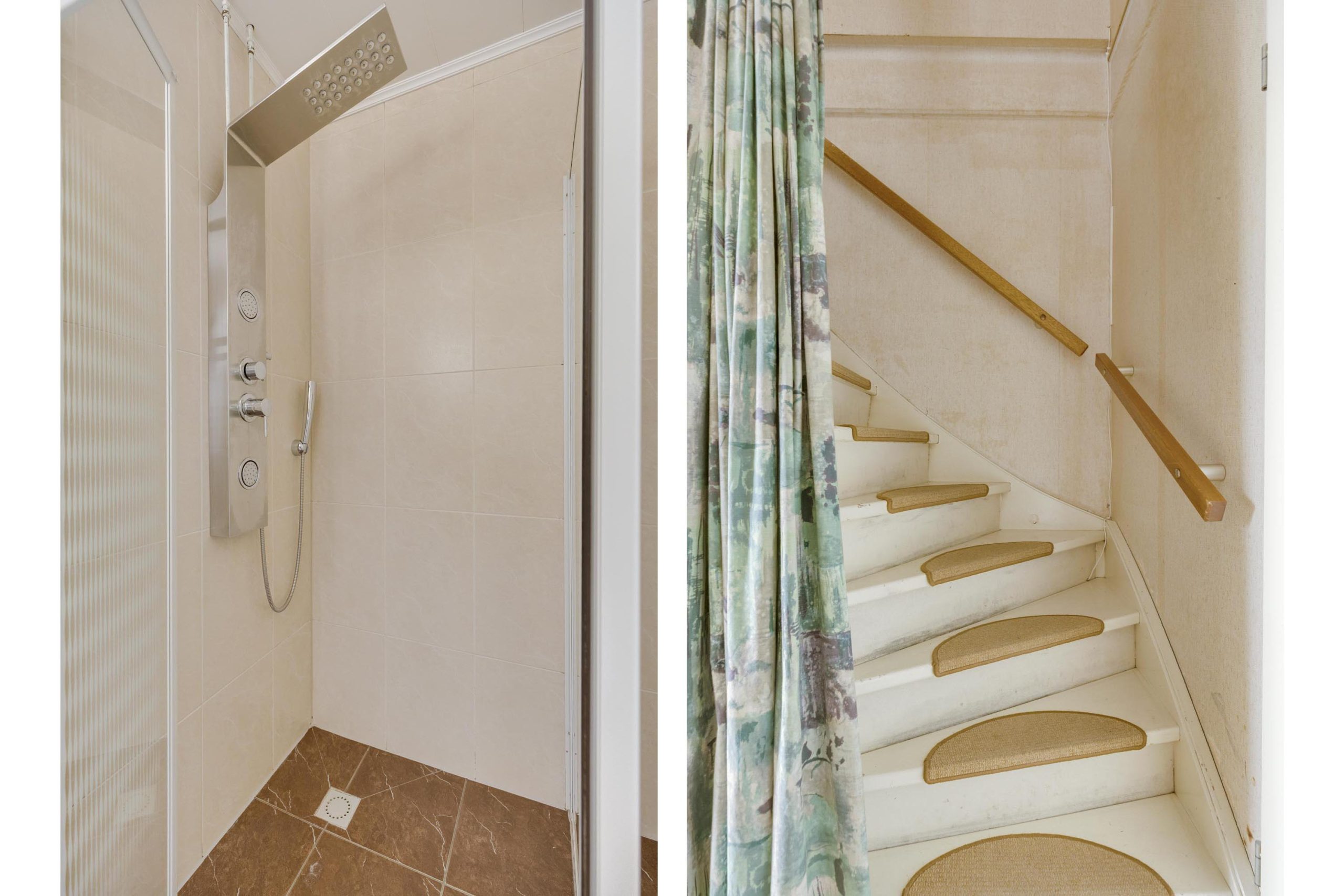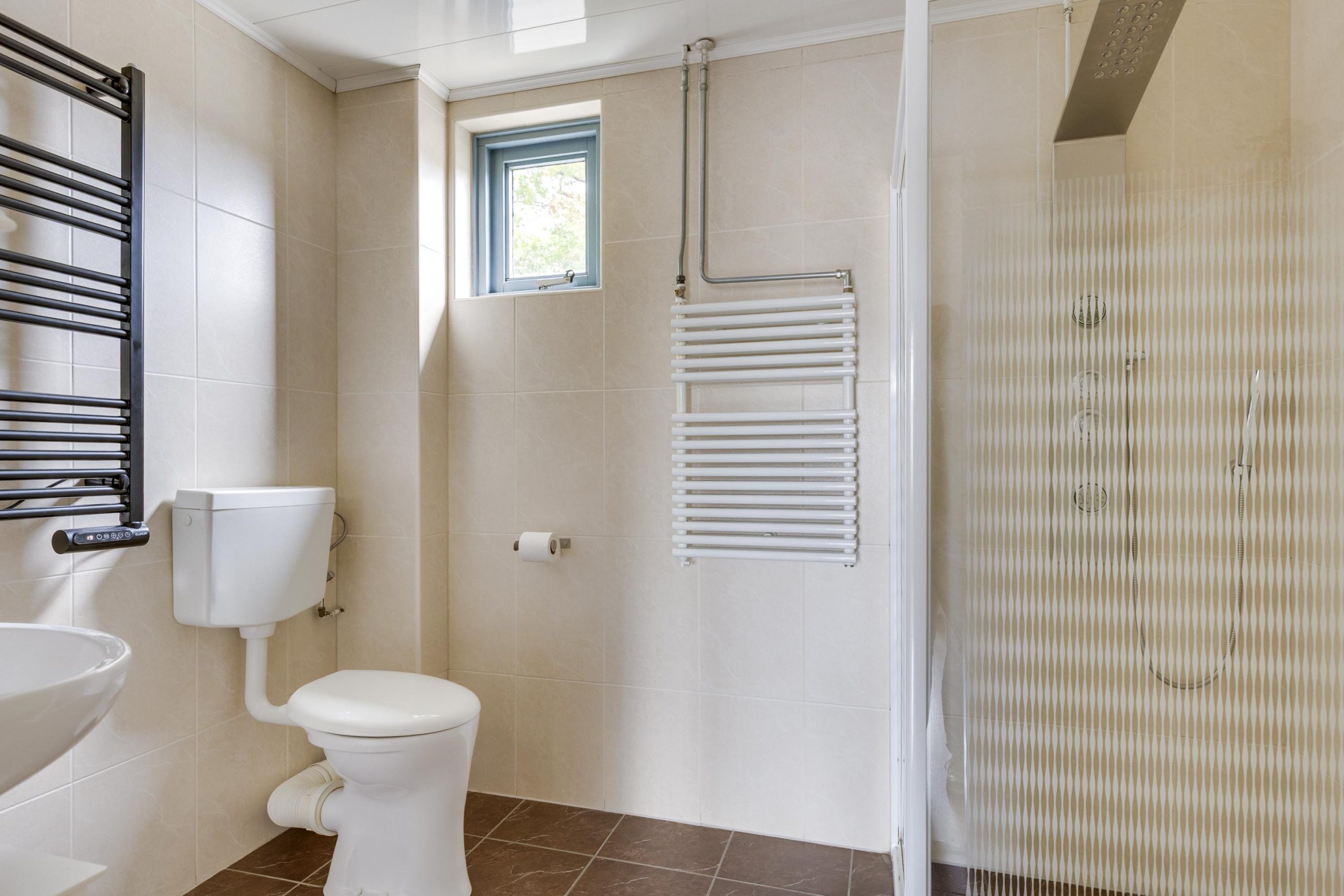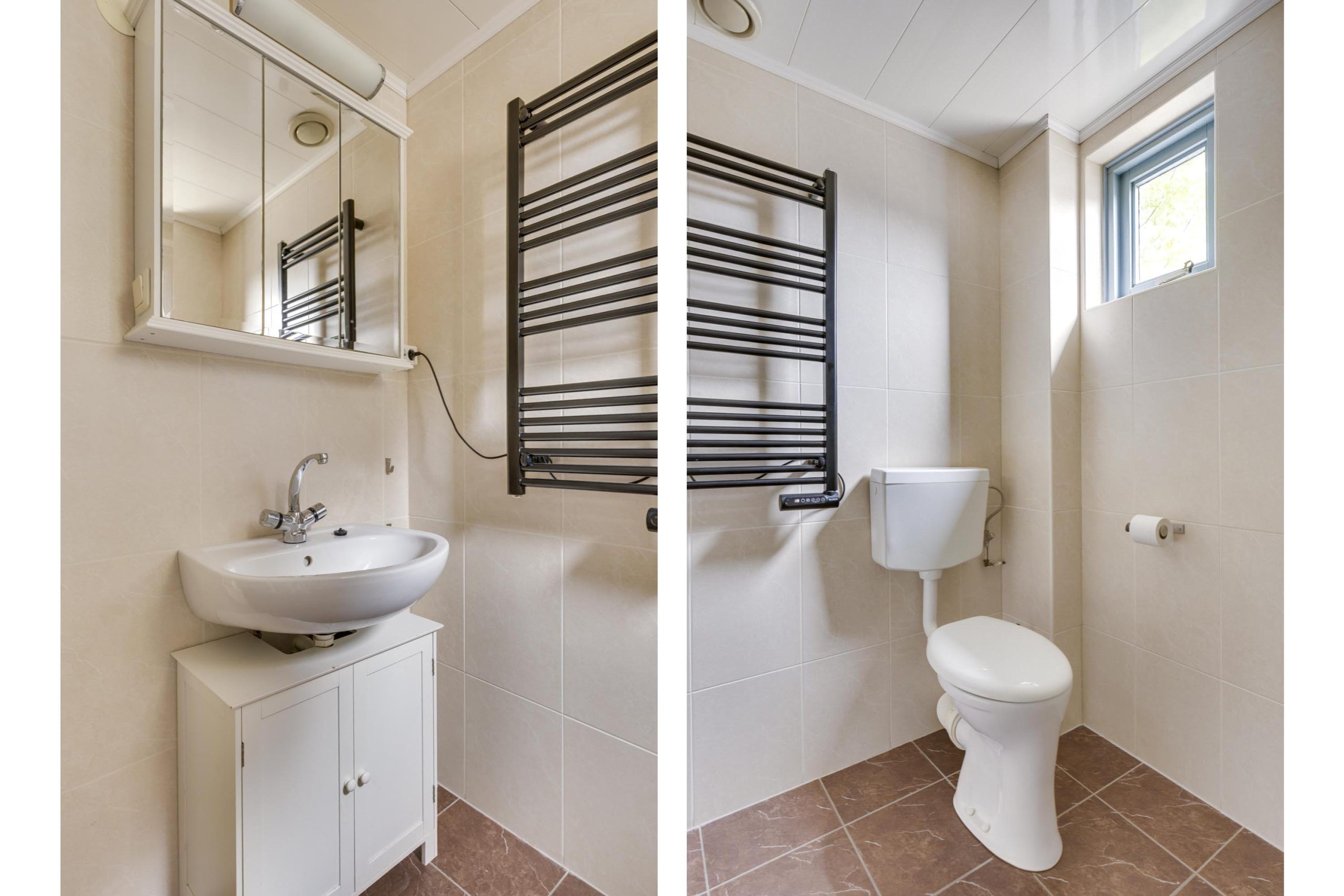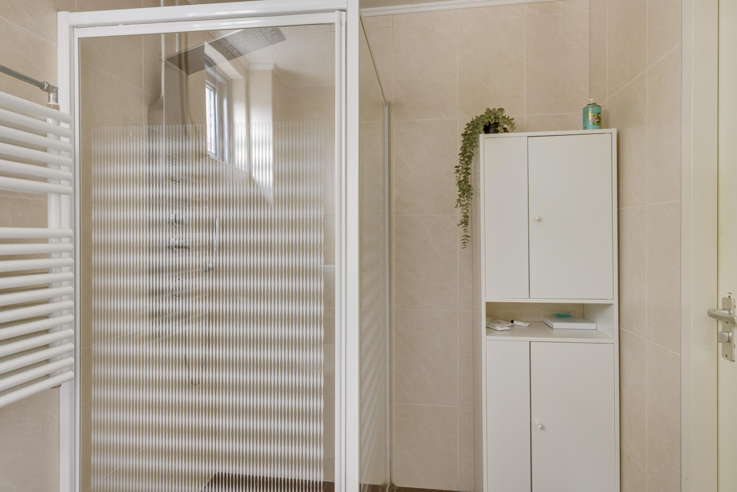 De badkamer is gelegen aan de voorzijde en is geheel gemoderniseerd en betegeld in 2016 en voorzien van douchecabine, toilet, wastafel met spiegelkast en verlichting, elektrische designradiator, mechanische ventilatie en een uitzetraam.