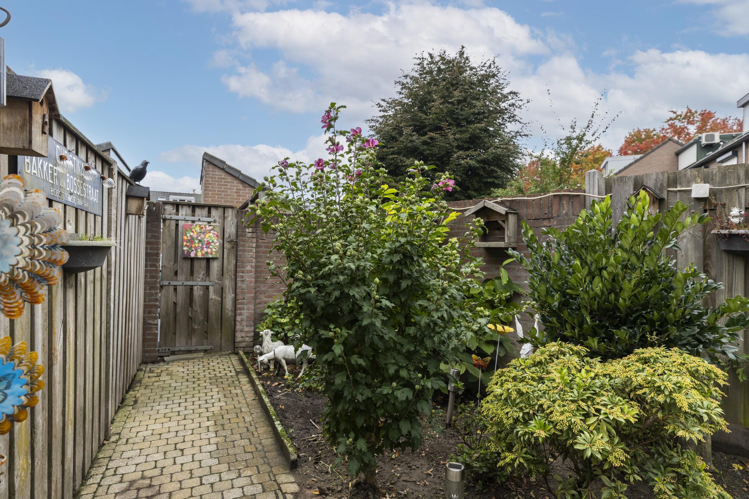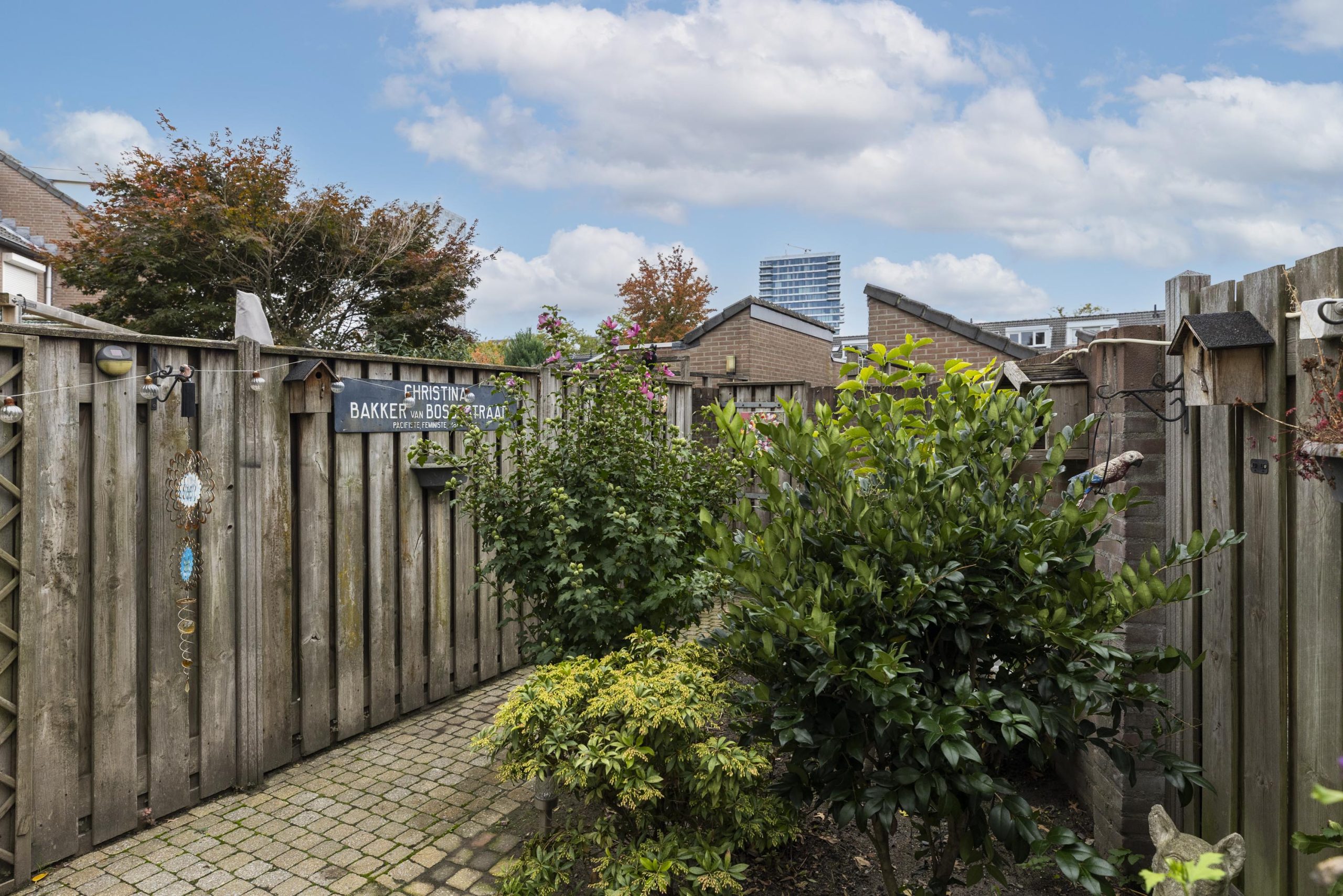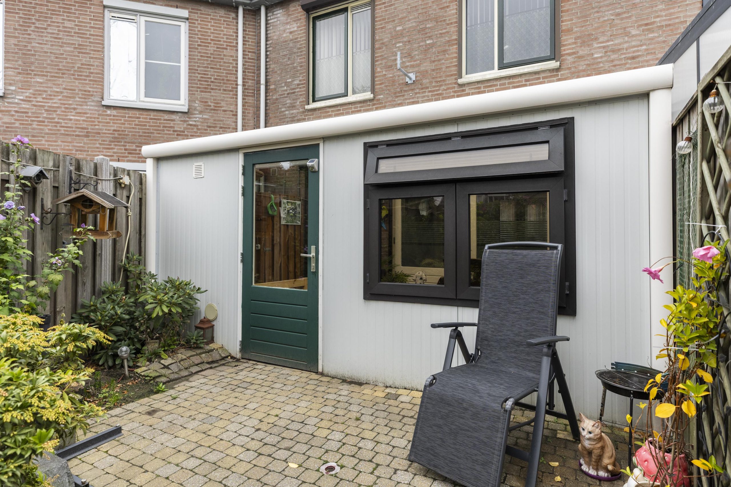 De achtertuin is onderhoudsvriendelijk, deels betegeld en voorzien van borders, struiken en buitenverlichting. Verder vindt u hier de achterom naar de brandgang en nabijgelegen parkeerterrein.